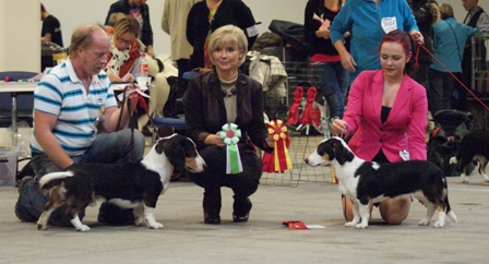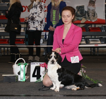 4v. Hyvä koko & oikeat mittasuhteet. Erinomainen pää, tummat silmät, hyvä purenta. Selvä eturinta, hyvä runko, tyypilliset kulmaukset, hieman korkea kinner, hyvät käpälät. Tiivis hyvä turkki. Voisi liikkua pidemällä askeleellä. Rauhallinen & varma