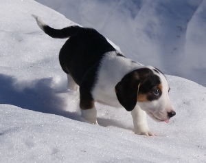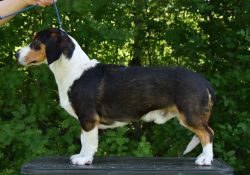 Kolmivärinen, 33 cm. Mittasuhteiltaan erinomainen. Kapea pää. Hyvät korvat. Kuiva kaula. Tiivis ylälinja. Kokonaisuuteen sopiva raajaluusto. Hyvät kulmaukset. Hyvä karvapeite. Oikea liike. Miellyttävä luonne.