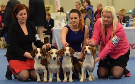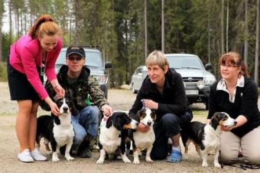 kuva: Sami PöllänenRyhmässä narttu, ja neljä pentua kahdesta eri yhdistelmästä. Ryhmä on tasainen. Kaikilla ryhmän koirilla on oikeat mittasuhteet ja mikä tärkeää, hyvin kulmautuneet raajat. Ryhmän koirat esiintyvät hyvin ja ovat luonteeltaan tasapainoisia. Myös karvapeitteet ovat oikeaa laatua.